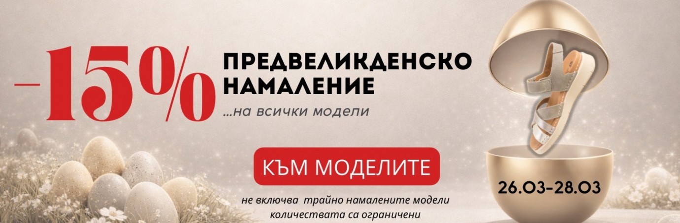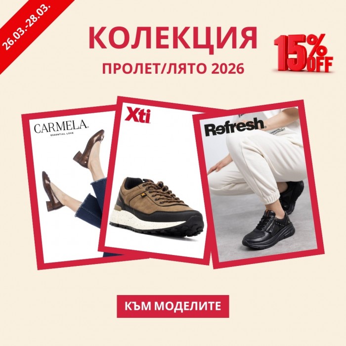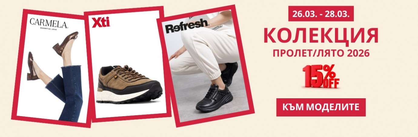 - Домашни пантофи(13) PREMIUM BRANDS(481) РАЗПРОДАЖБА(0) Бразилски джапанки и сандали IPANEMA(55) Маратонки и кецове Cortina - Белгия(33) Дамски чанти - последни бройки(59) Испанско лято (124) CARMELA, XTI и REFRESH(48) СЕЗОННИ НАМАЛЕНИЯ (355) JANA и S.OLIVER(134) Испанска коледа(22) Намалени обувки(27) Anekke Есен/Зима 2025-2026 намаление(35) Намалени модели(56) Anekke 2026 Пролет/Лято(141) Дамски боти от 20 до 50 евро(90) Осми Март (416)