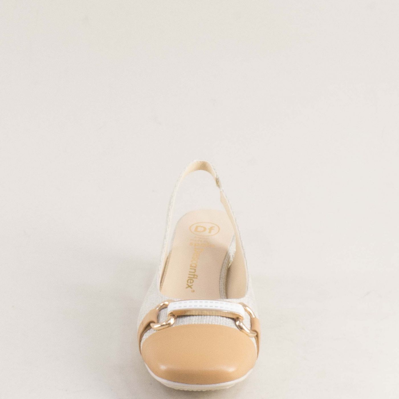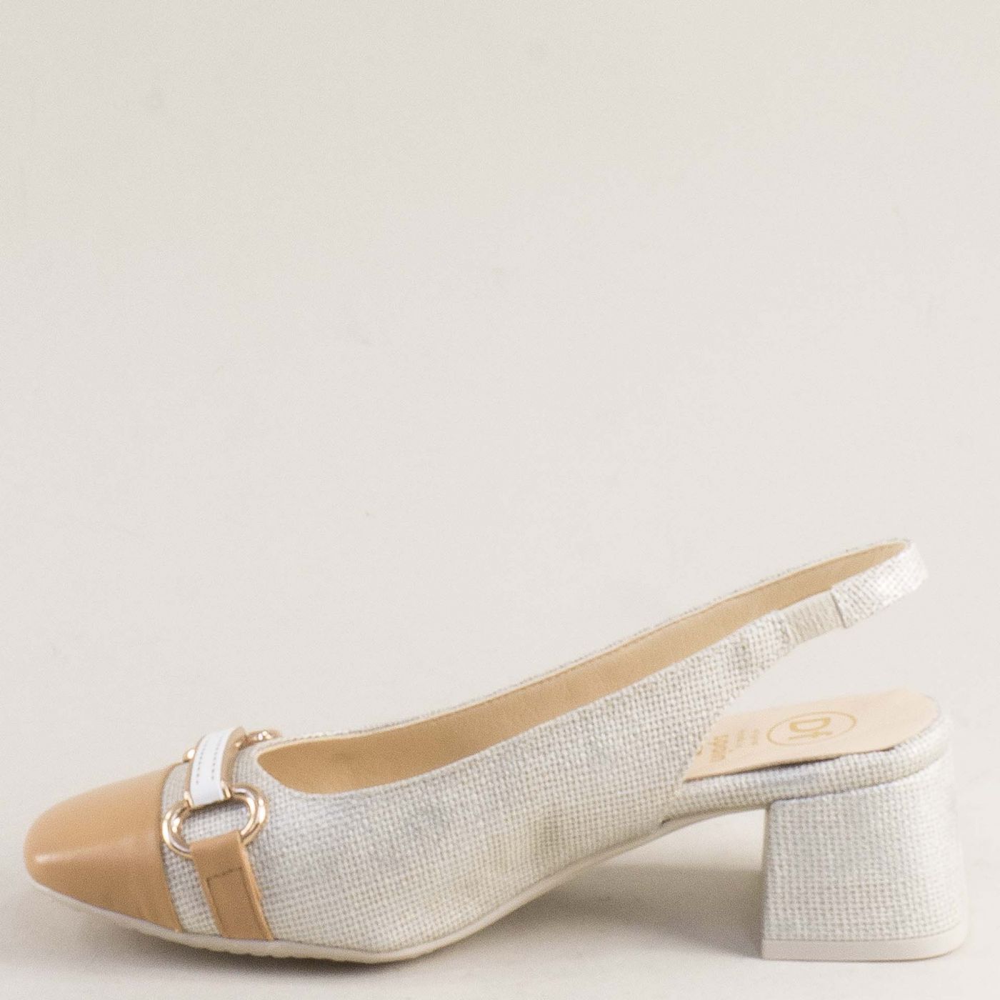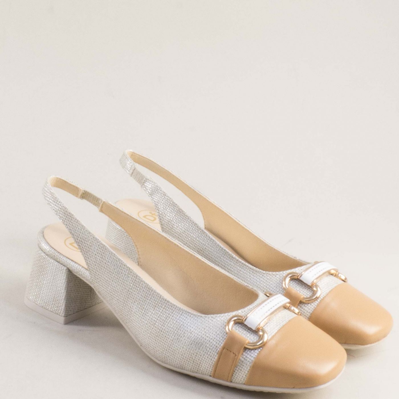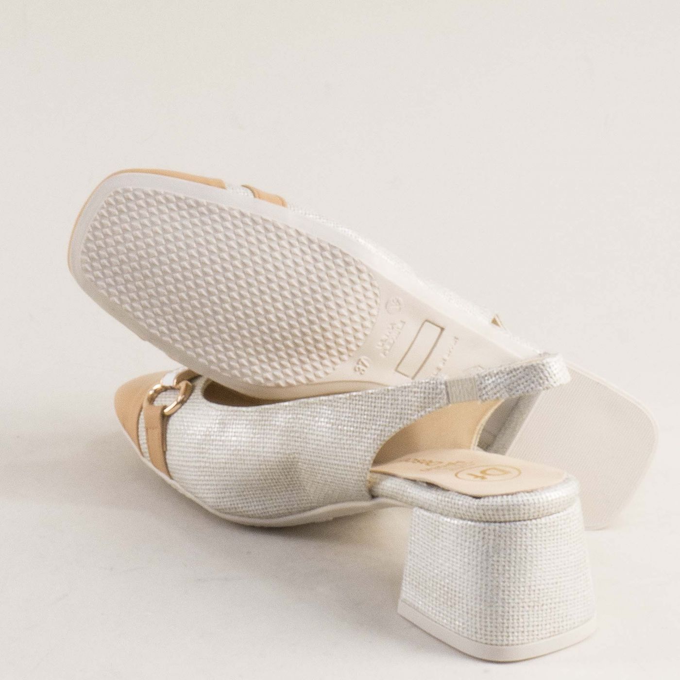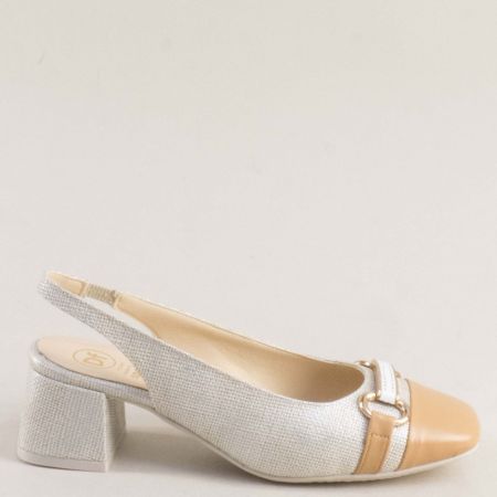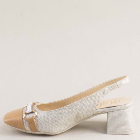 Сребърни дамски елегантни сандали с бежова декорация на ток 28127sr